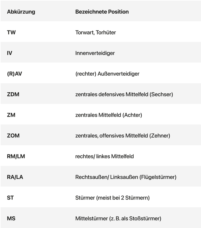 Damit eine Mannschaft erfolgreich spielen kann, hat jeder Spieler eine ganz bestimmte Rolle - die Position. Sie gibt an, welche Aufgaben er im Spiel hat.