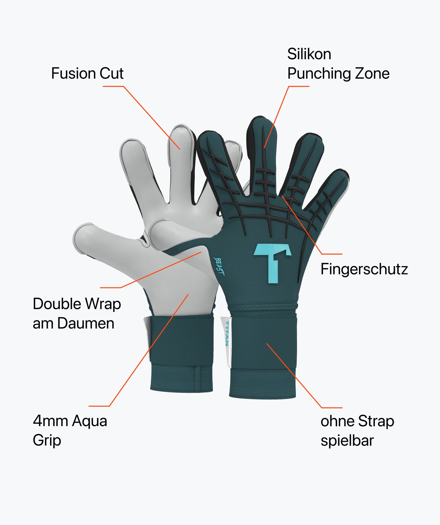 Innovative Silikon Punching Zone in cooler Beast Optik. Einzeln entnehmbare Fingerschutz Elemente. Atmungsaktives Mechano 2.0 Material. Fusion Cut für maximale Kontaktfläche. Verlängerter Haftschaum.