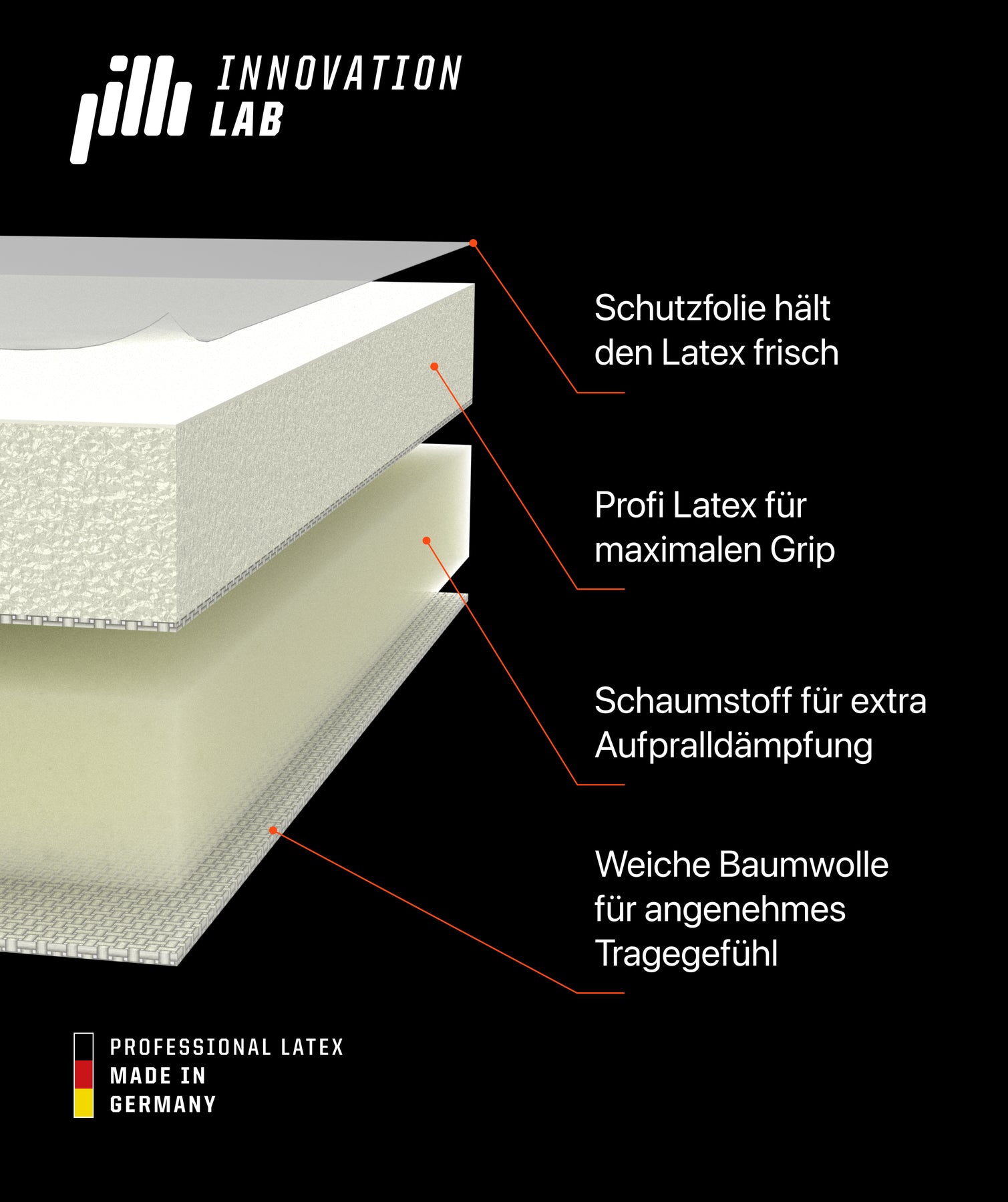 Wir haben zum Beispiel einen widerstandsfähigeren Latex speziell für Kunstrasen oder den Einsatz im Jugendbereich und einen Latex speziell für nasses Wetter. Es kommt immer auf die Bedingungen an, unter denen du deine Handschuhe einsetzen willst.