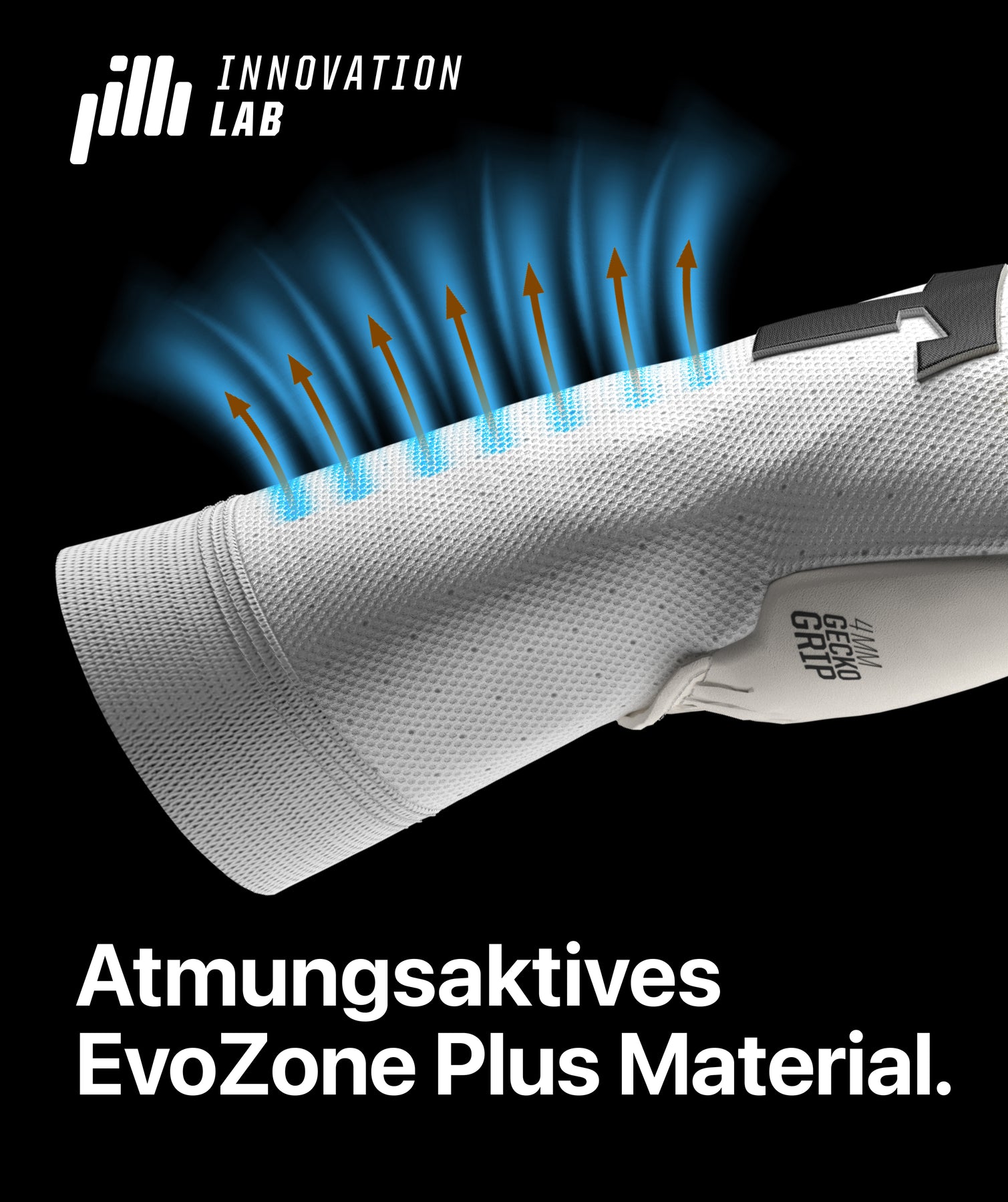 Das speziell perforierte EvoZone Plus Material sorgt für grandiose Atmungsaktivität und super stabilen Halt. So werden die Hände durch das superleichte Material aktiv gestützt und noch besser belüftet.