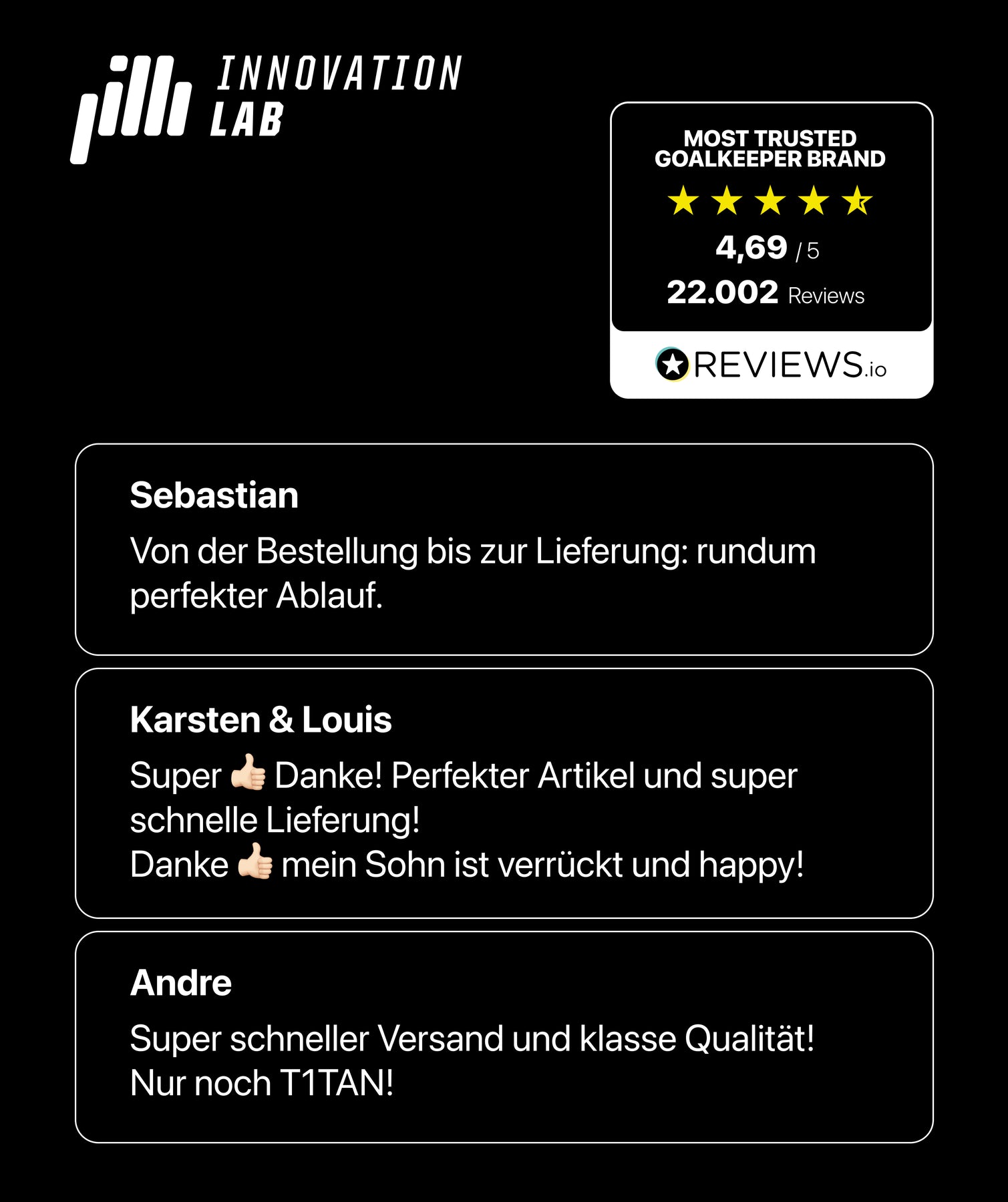 • Profis verwenden unsere Torwarthandschuhe in der Regel nur einige Wochen, da die Belastung auf diesem Niveau extrem hoch ist. Bei T1TAN erhältst du die gleiche Qualität wie die Profis.