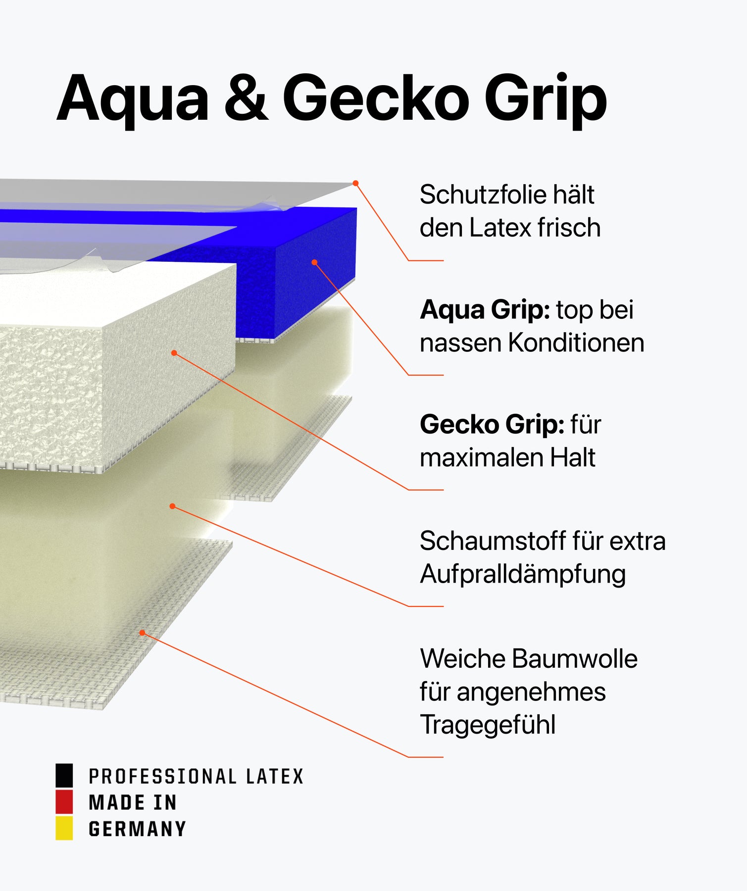 Ultimativer Grip bei jedem Wetter dank der Kombination aus Aqua Grip an den Fingerspitzen und Gecko Grip an den Handflächen.