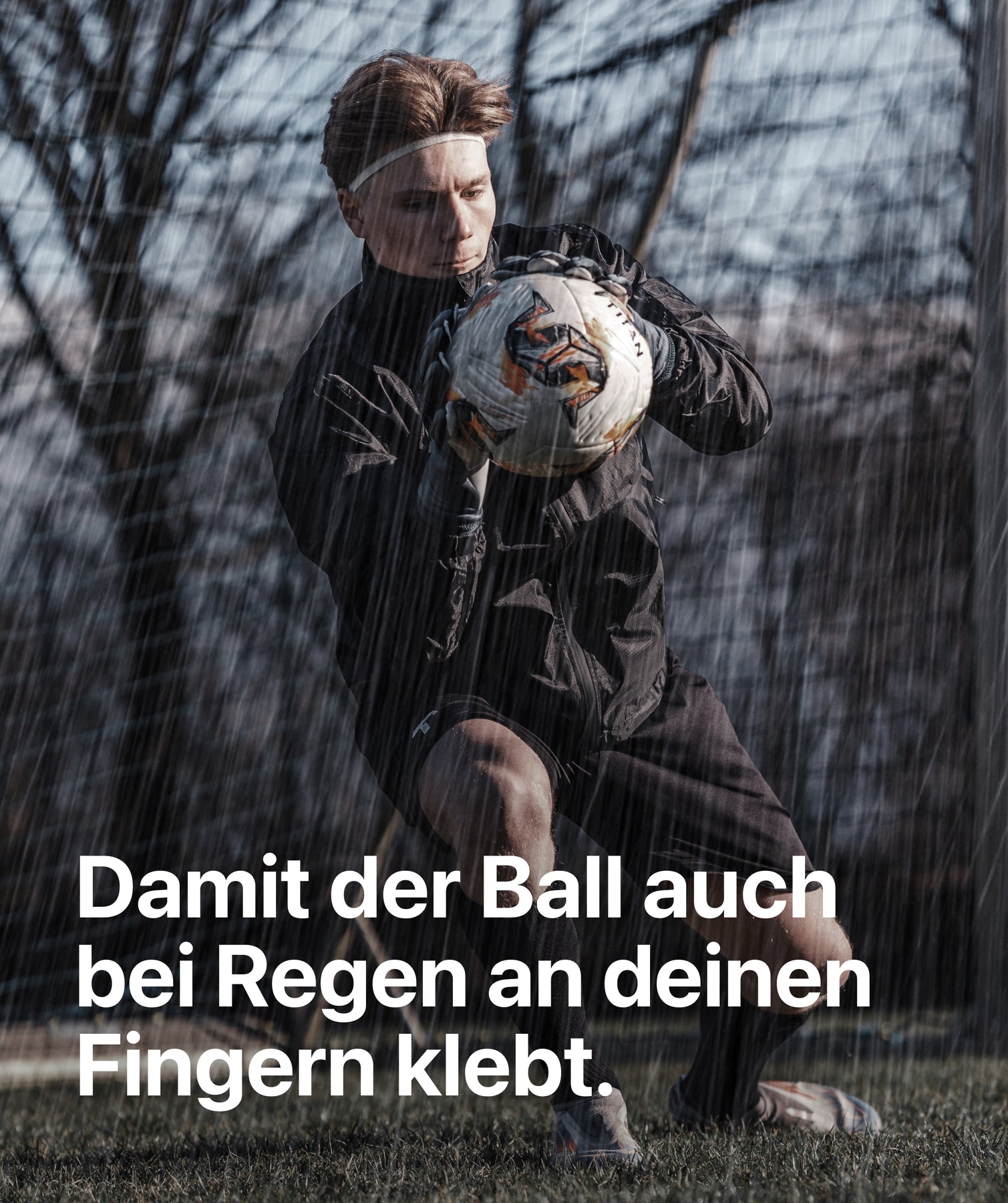 Als Torwart ist es wichtig, sich auch bei feuchten Witterungsbedingungen absolut auf den Grip seiner Torwarthandschuhe verlassen zu können. Wasser auf Bällen und dem Latex reduziert jedoch die Haftung - Wie beim Aquaplaning auf der Straße.