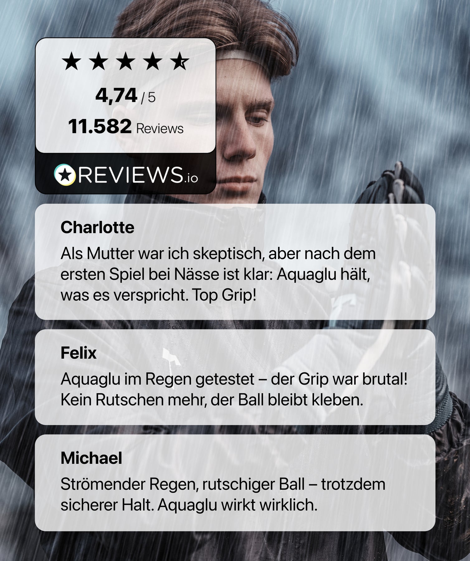 Der AQUAGLU wirkt bei Regen und Nässe. Wir empfehlen dir, dass du bei Regen regelmäßig eine Faust machst und die Handschuhe auswringst. Dadurch verdrängst du schon Wasser aus dem Latex, bevor der Ball darauf auftrifft. Für trockenes Wetter empfehlen wir den TURBOGLU.